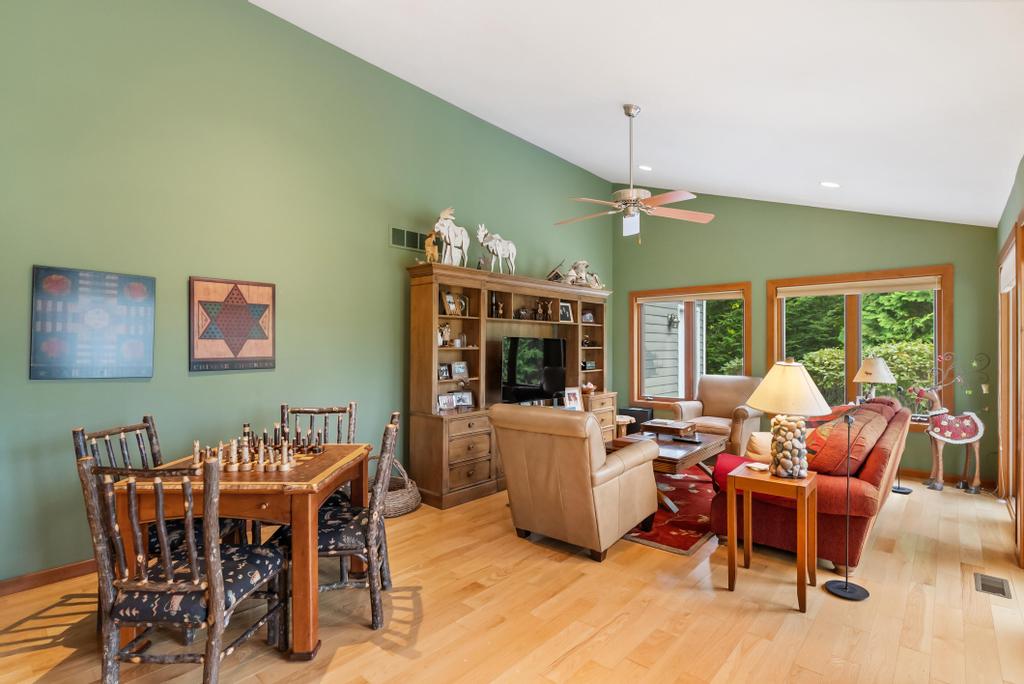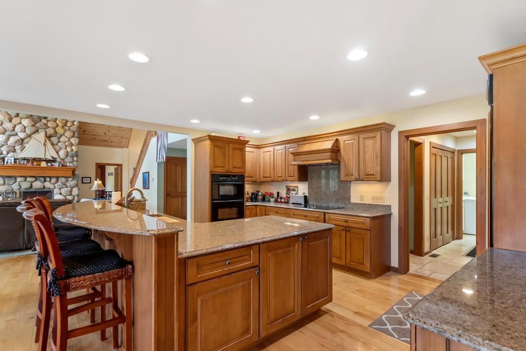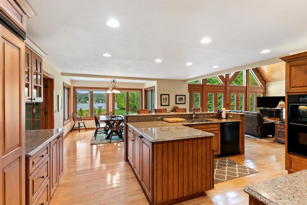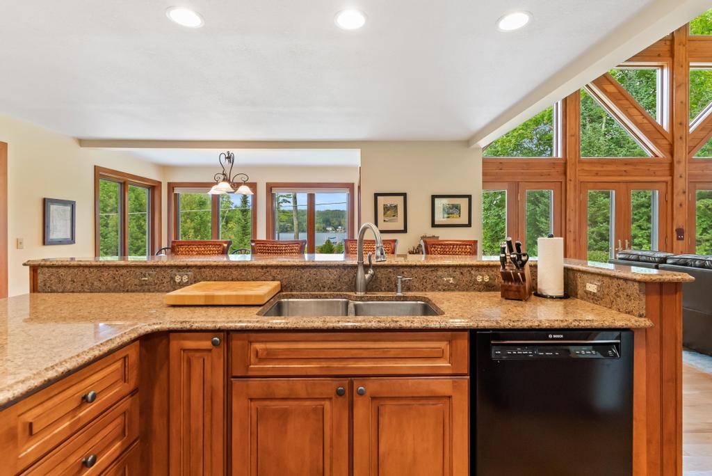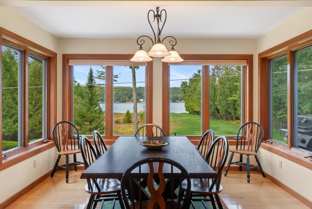 Featuring open-concept living spaces with large windows that flood the home with natural light and a fully equipped kitchen to make entertaining easy and gives you access to all the items needed for your stay. The cozy living room is spacious and invites you to relax and unwind while providing easy access to the back patio. On the other side of the kitchen is a sun room offering additional lounging space or the perfect spot for your morning coffee as you watch the sun rise over the lake.