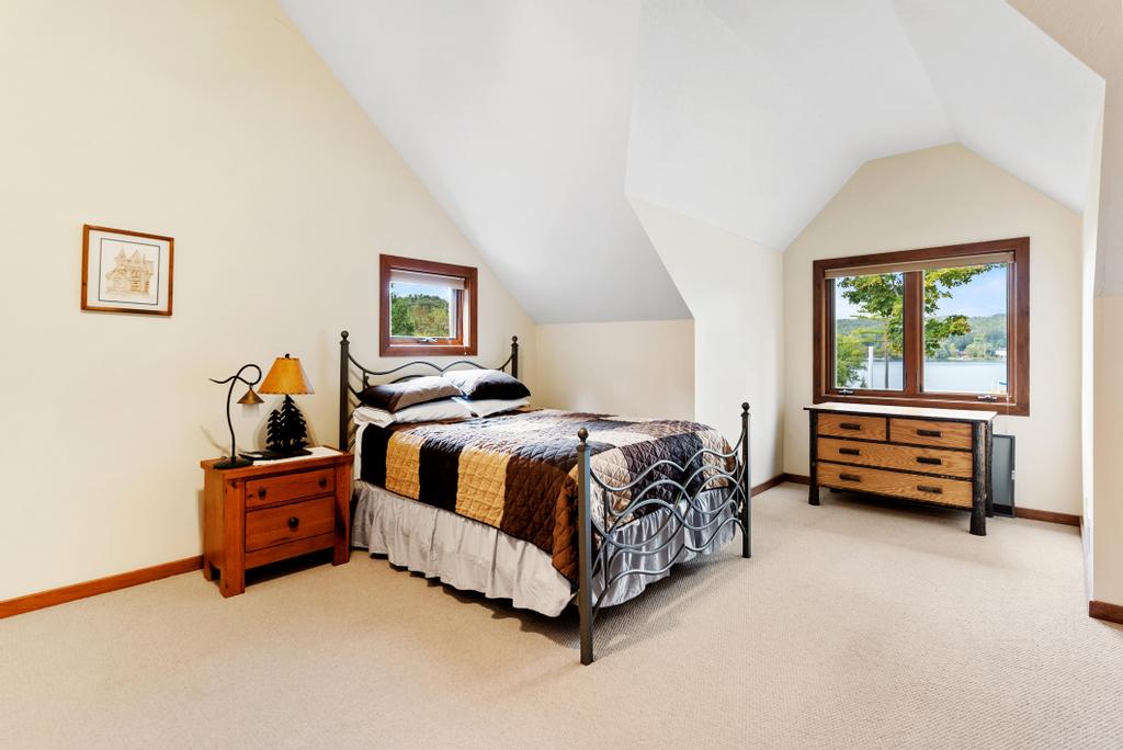 Off of the living room area is the master bedroom featuring a king size bed, outdoor patio access and a large en suite with a double vanity, shower and tub. Upstairs are 3 more bedrooms and a reading nook above the living room offering more space for privacy or just a cozy spot to read. There are 2 more full bathrooms upstairs as well. The back patio wraps around the back of the house with plenty of seating/dining, a grill and gorgeous lake views. The lawn is level and grassy and leads out to the dock and water. Trees surround the home creating the perfect amount of privacy.