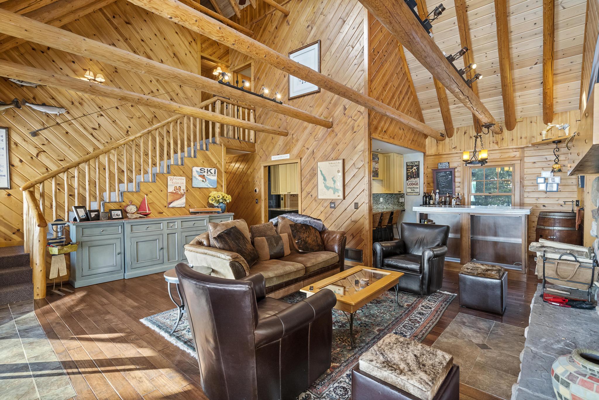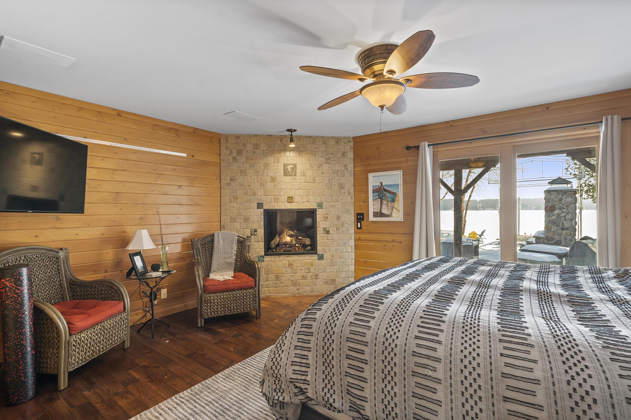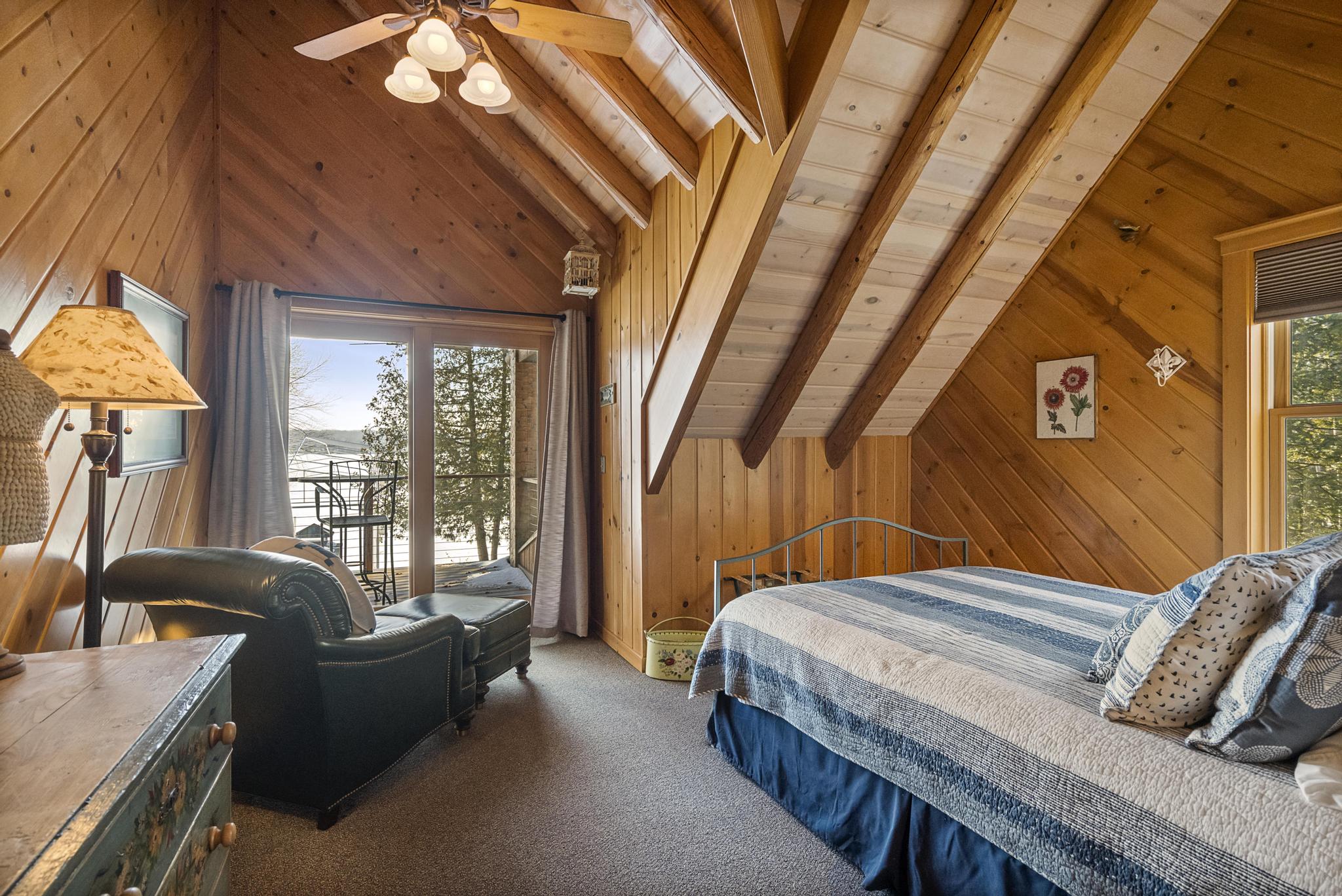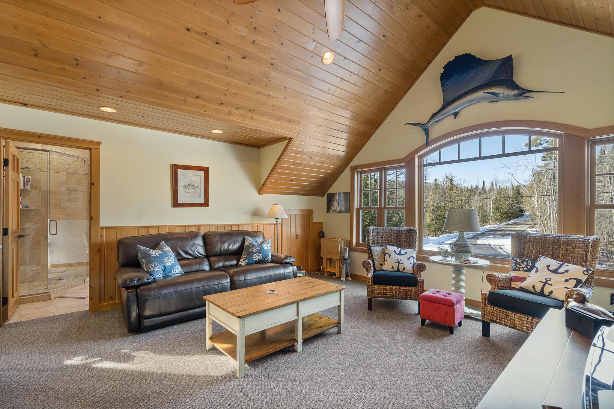 This house features 5 bedrooms 4 and a half bathrooms and 5,000 square feet of living space. The kitchen is perfectly stocked for anyone looking to cook in. The living room area gives off a cottagey vibe that showcases large windows with beautiful lake views. No detail was missed on this meticulously maintained and tastefully designed home. The master suite is located on the main level and has an attached full bathroom with heated floors, European style glass shower, jetted tub and heated shower bars (no door on bathroom, so recommended use for guests staying in the suite). Attached to this master suite is another office/sleeping area with a full futon, best suited for children of couple staying in the master suite.