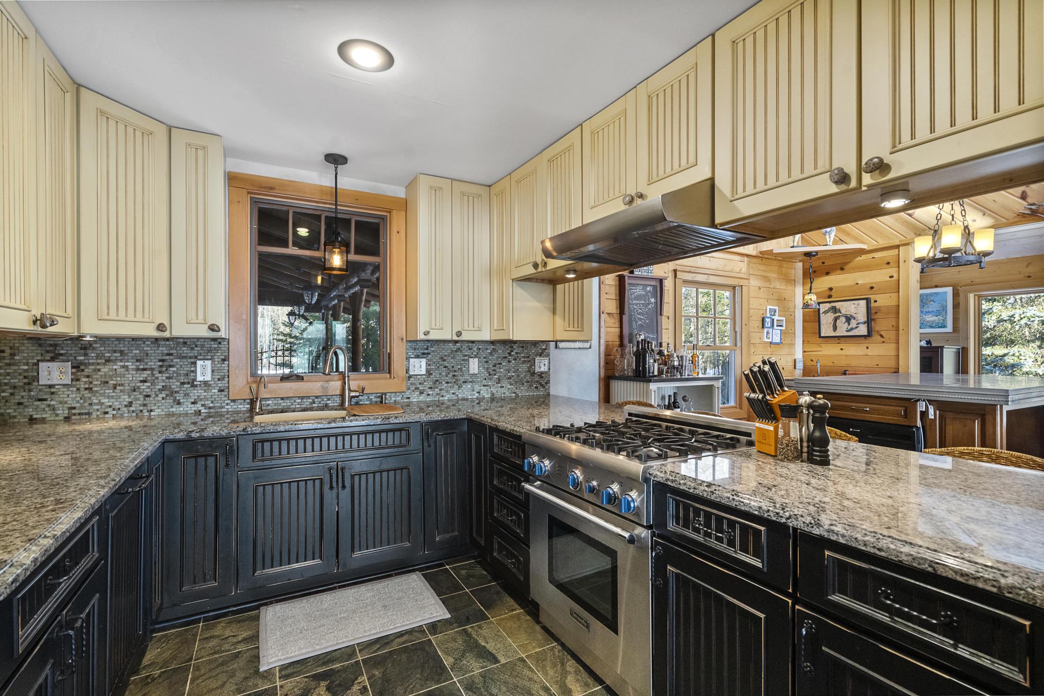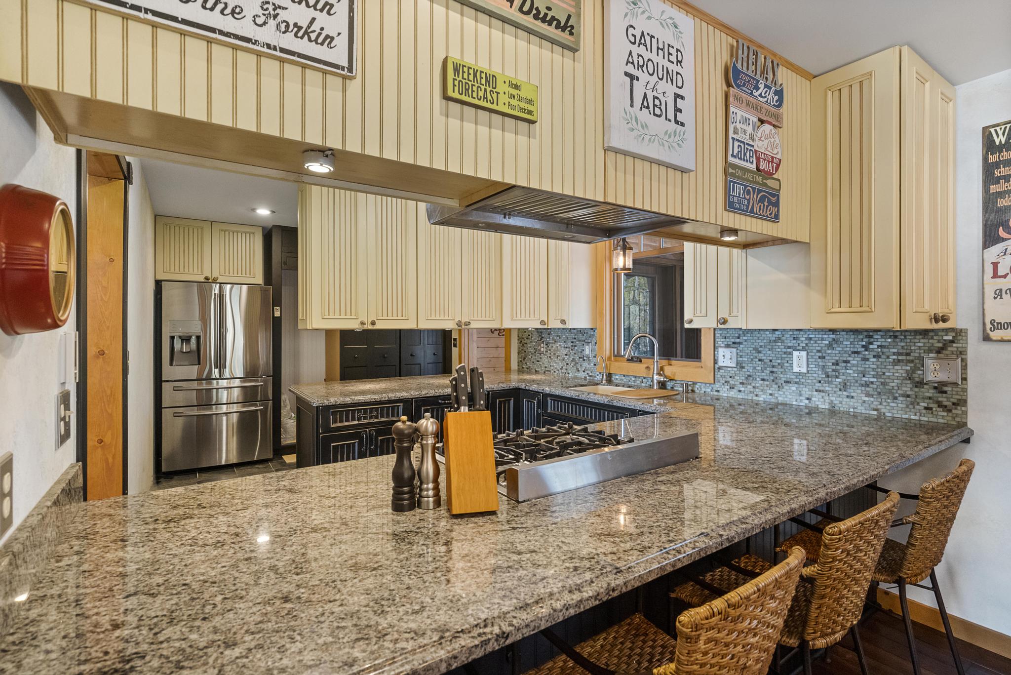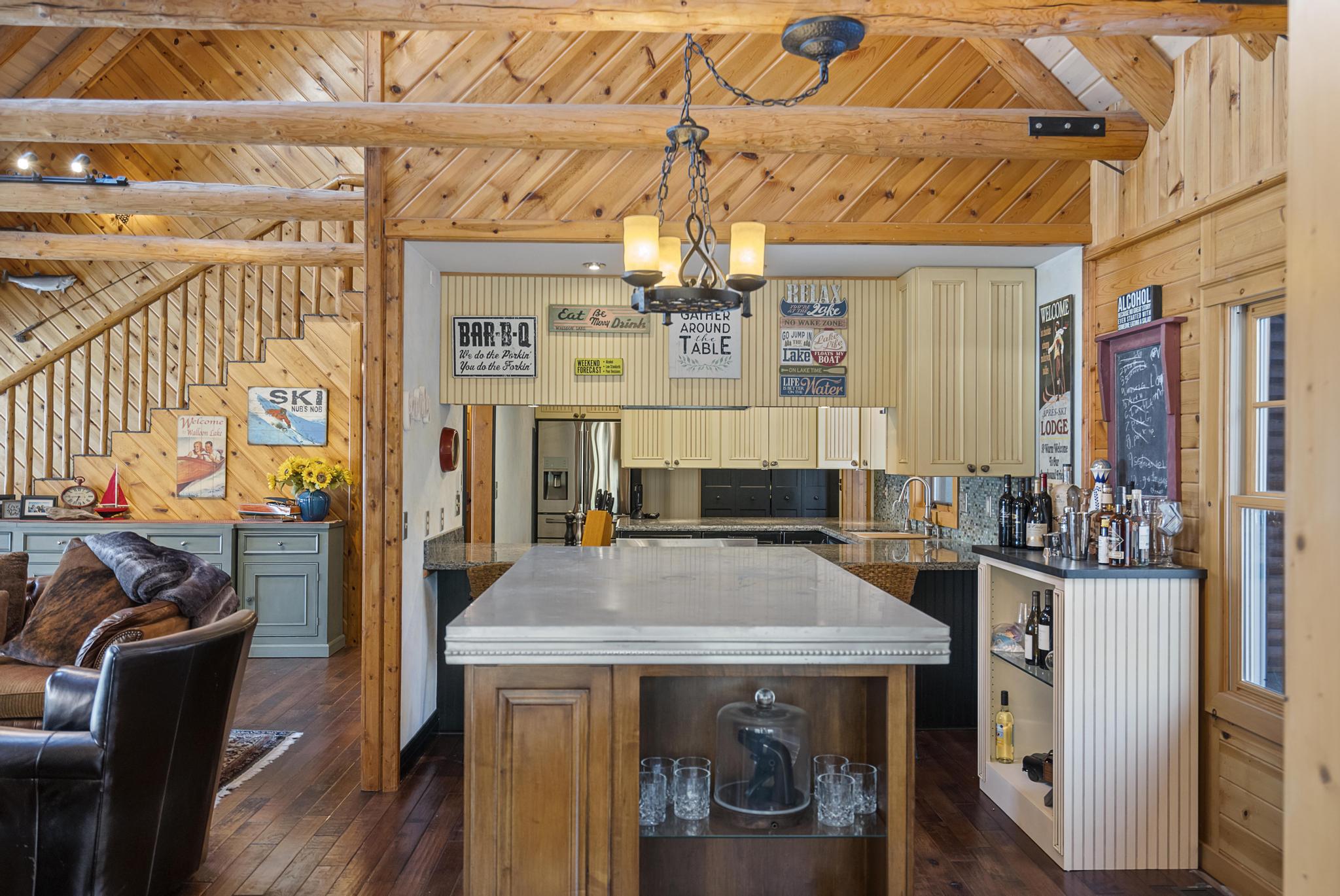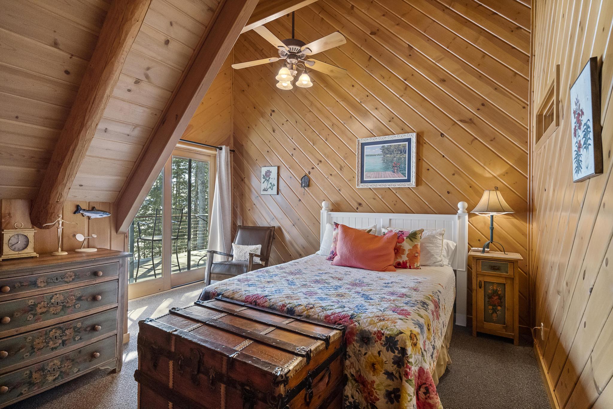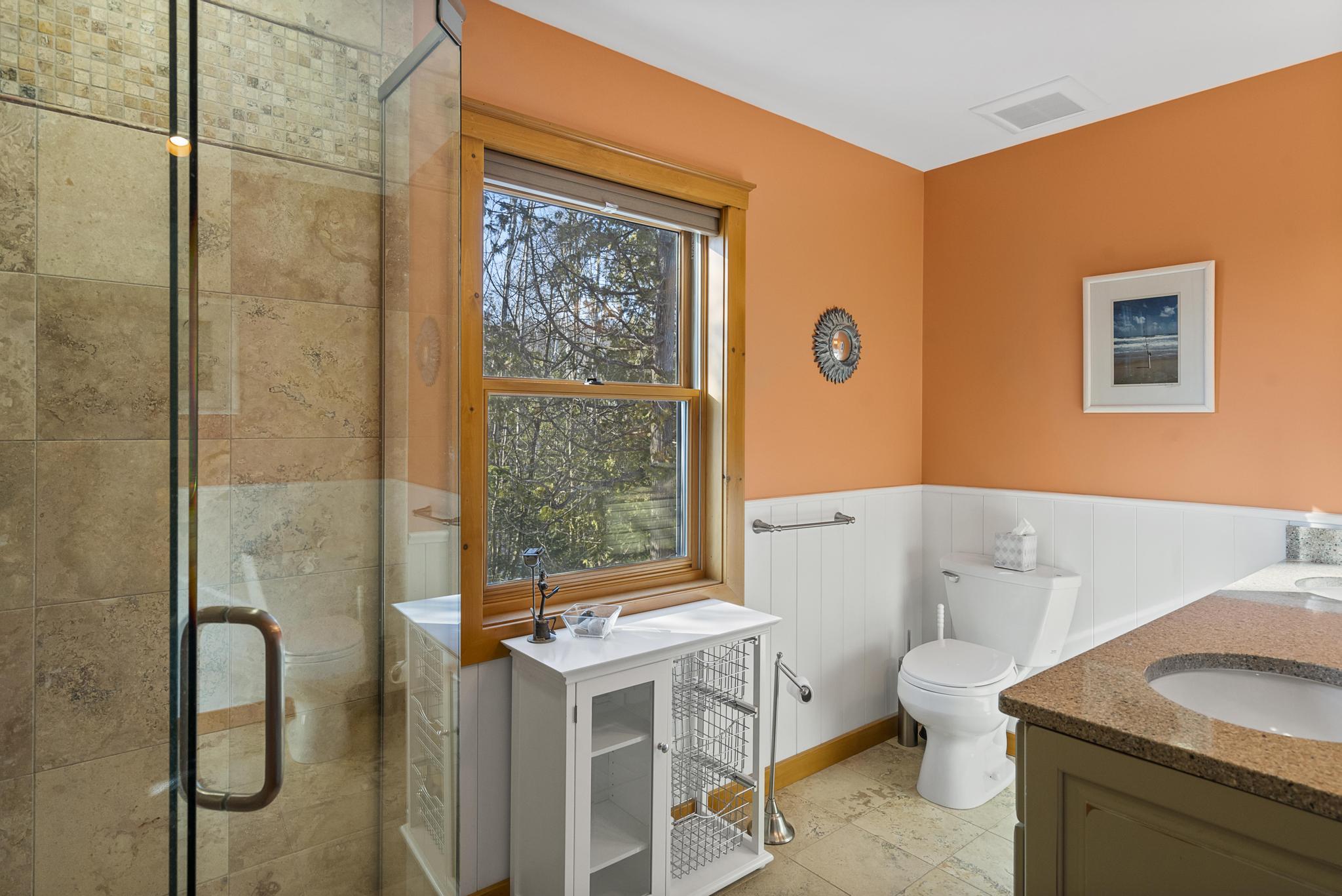 This house features 5 bedrooms 4 and a half bathrooms and 5,000 square feet of living space. The kitchen is perfectly stocked for anyone looking to cook in. The living room area gives off a cottagey vibe that showcases large windows with beautiful lake views. No detail was missed on this meticulously maintained and tastefully designed home. The master suite is located on the main level and has an attached full bathroom with heated floors, European style glass shower, jetted tub and heated shower bars (no door on bathroom, so recommended use for guests staying in the suite). Attached to this master suite is another office/sleeping area with a full futon, best suited for children of couple staying in the master suite.