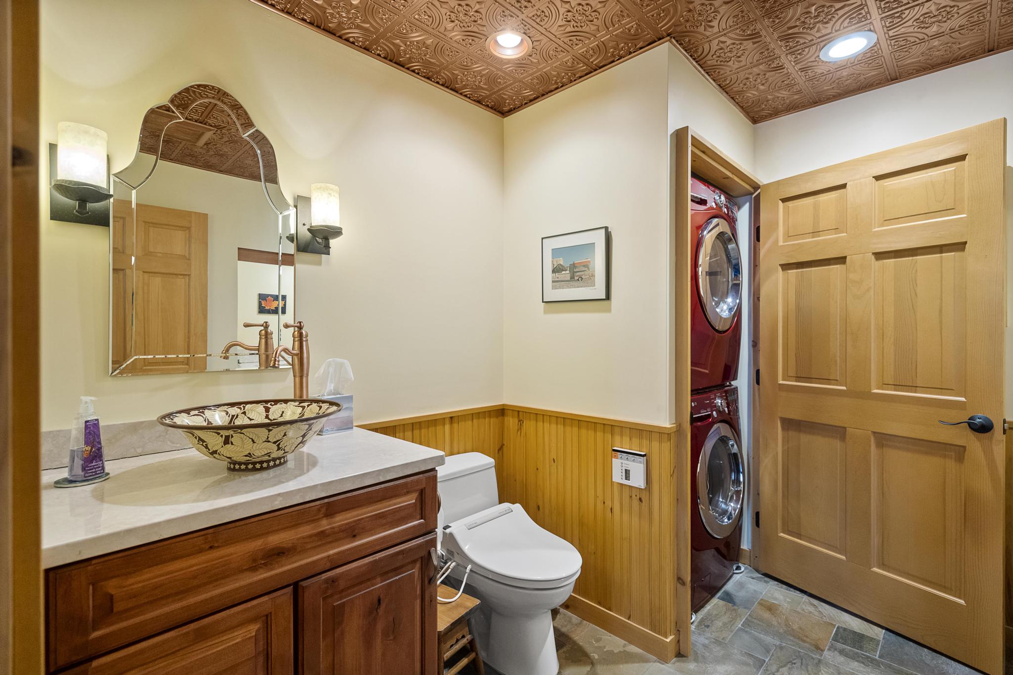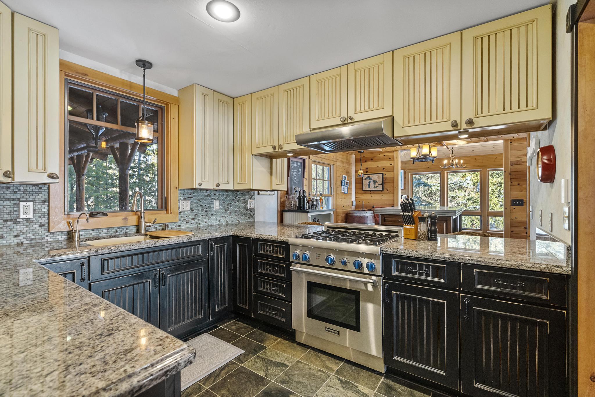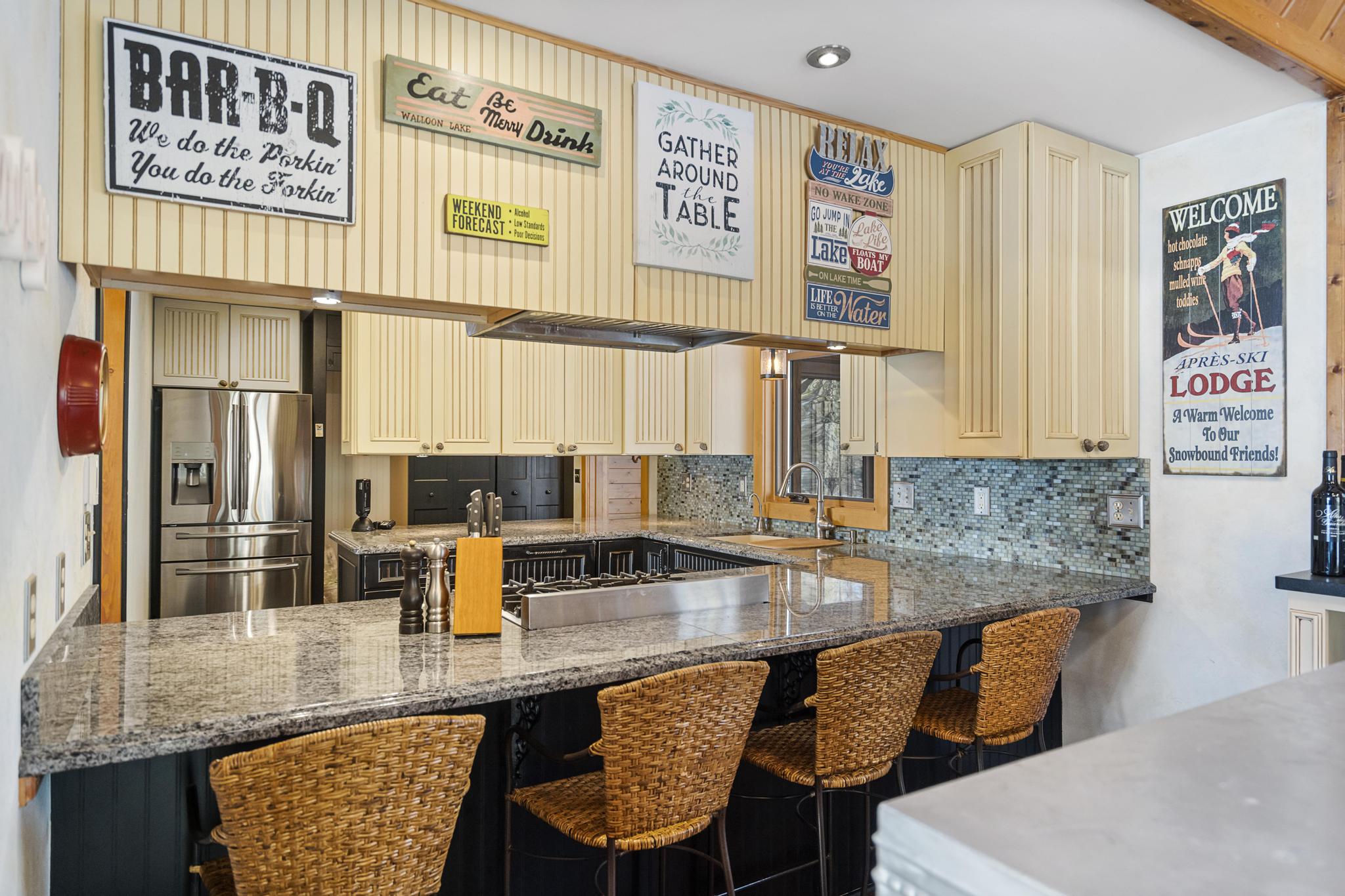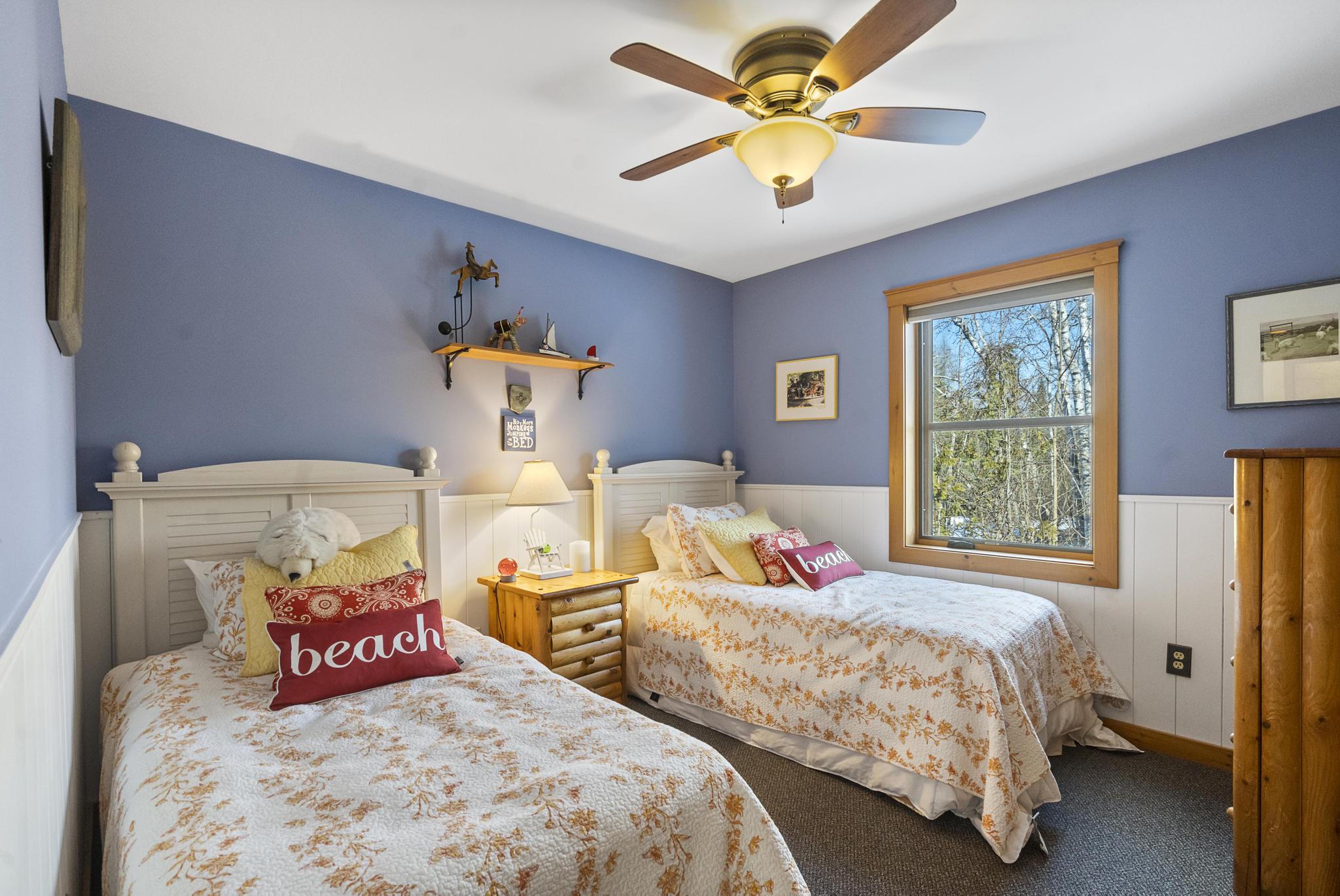 This house features 5 bedrooms 4 and a half bathrooms and 5,000 square feet of living space. The kitchen is perfectly stocked for anyone looking to cook in. The living room area gives off a cottagey vibe that showcases large windows with beautiful lake views. No detail was missed on this meticulously maintained and tastefully designed home. The master suite is located on the main level and has an attached full bathroom with heated floors, European style glass shower, jetted tub and heated shower bars (no door on bathroom, so recommended use for guests staying in the suite). Attached to this master suite is another office/sleeping area with a full futon, best suited for children of couple staying in the master suite.