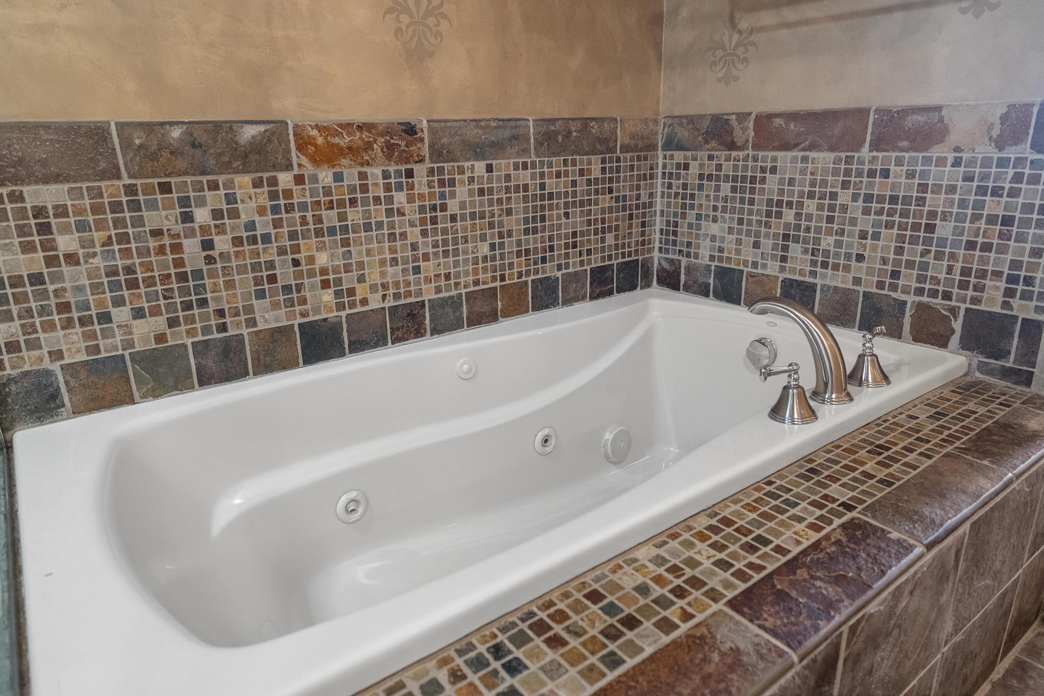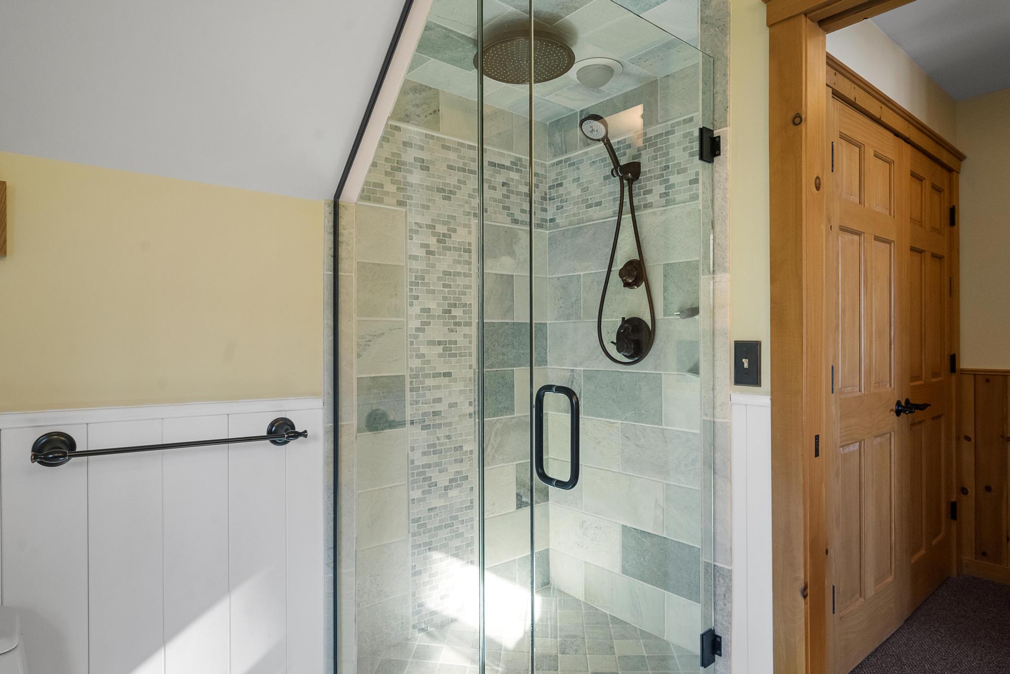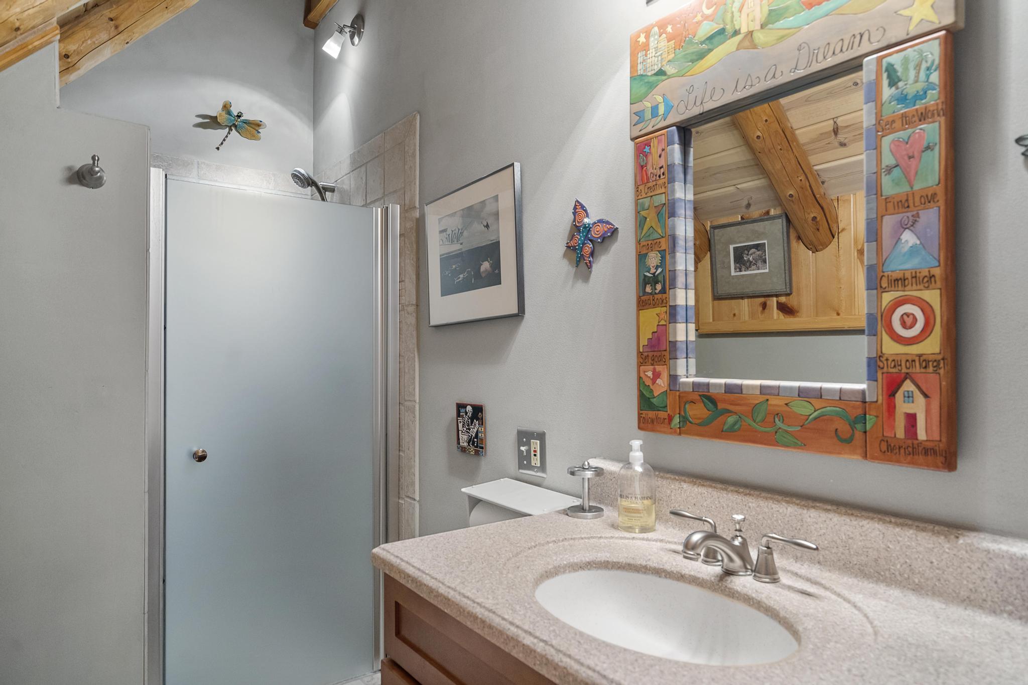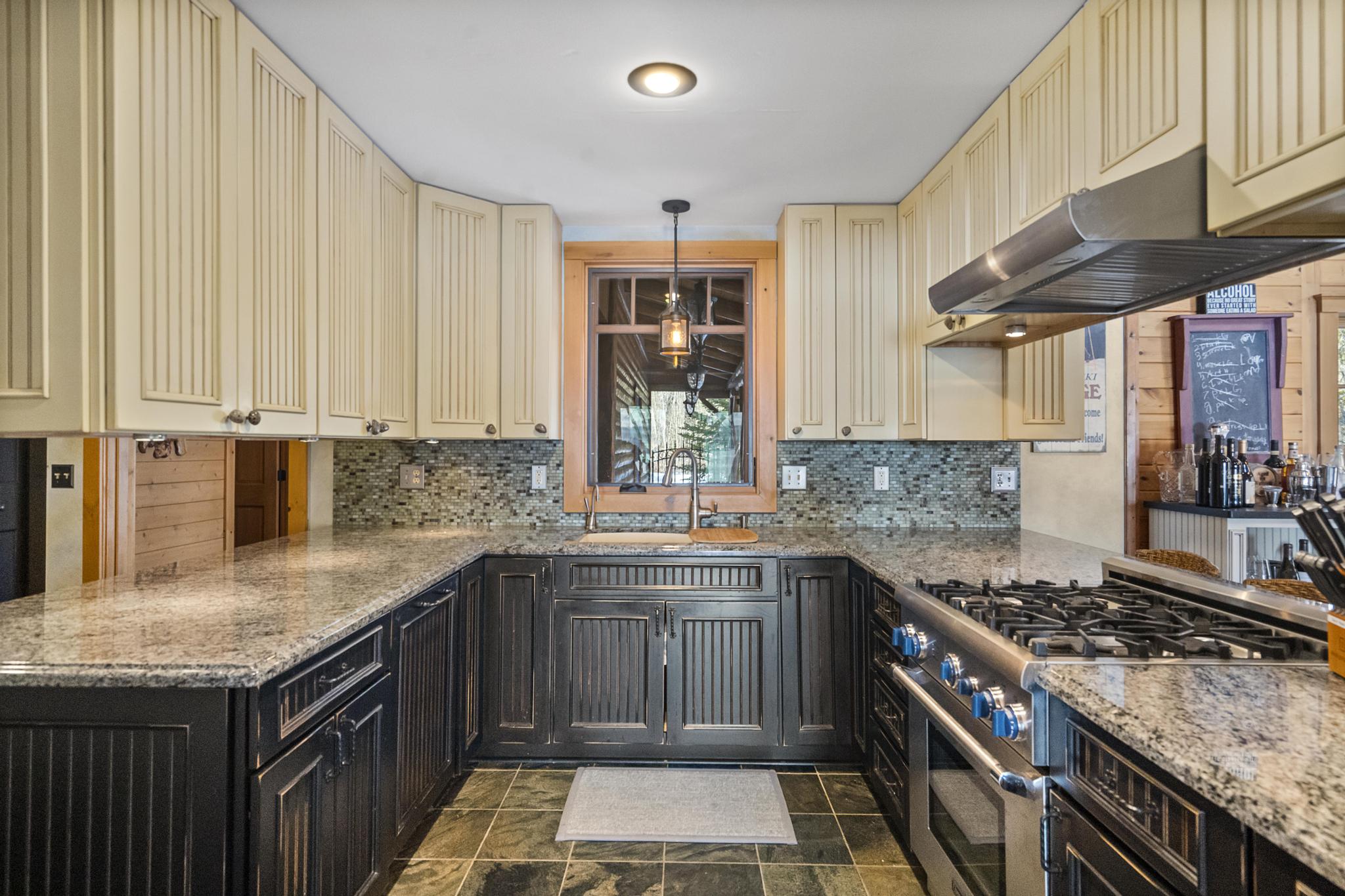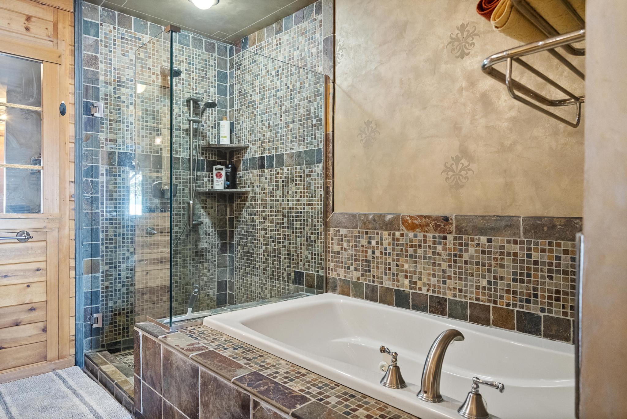 This house features 5 bedrooms 4 and a half bathrooms and 5,000 square feet of living space. The kitchen is perfectly stocked for anyone looking to cook in. The living room area gives off a cottagey vibe that showcases large windows with beautiful lake views. No detail was missed on this meticulously maintained and tastefully designed home. The master suite is located on the main level and has an attached full bathroom with heated floors, European style glass shower, jetted tub and heated shower bars (no door on bathroom, so recommended use for guests staying in the suite). Attached to this master suite is another office/sleeping area with a full futon, best suited for children of couple staying in the master suite.