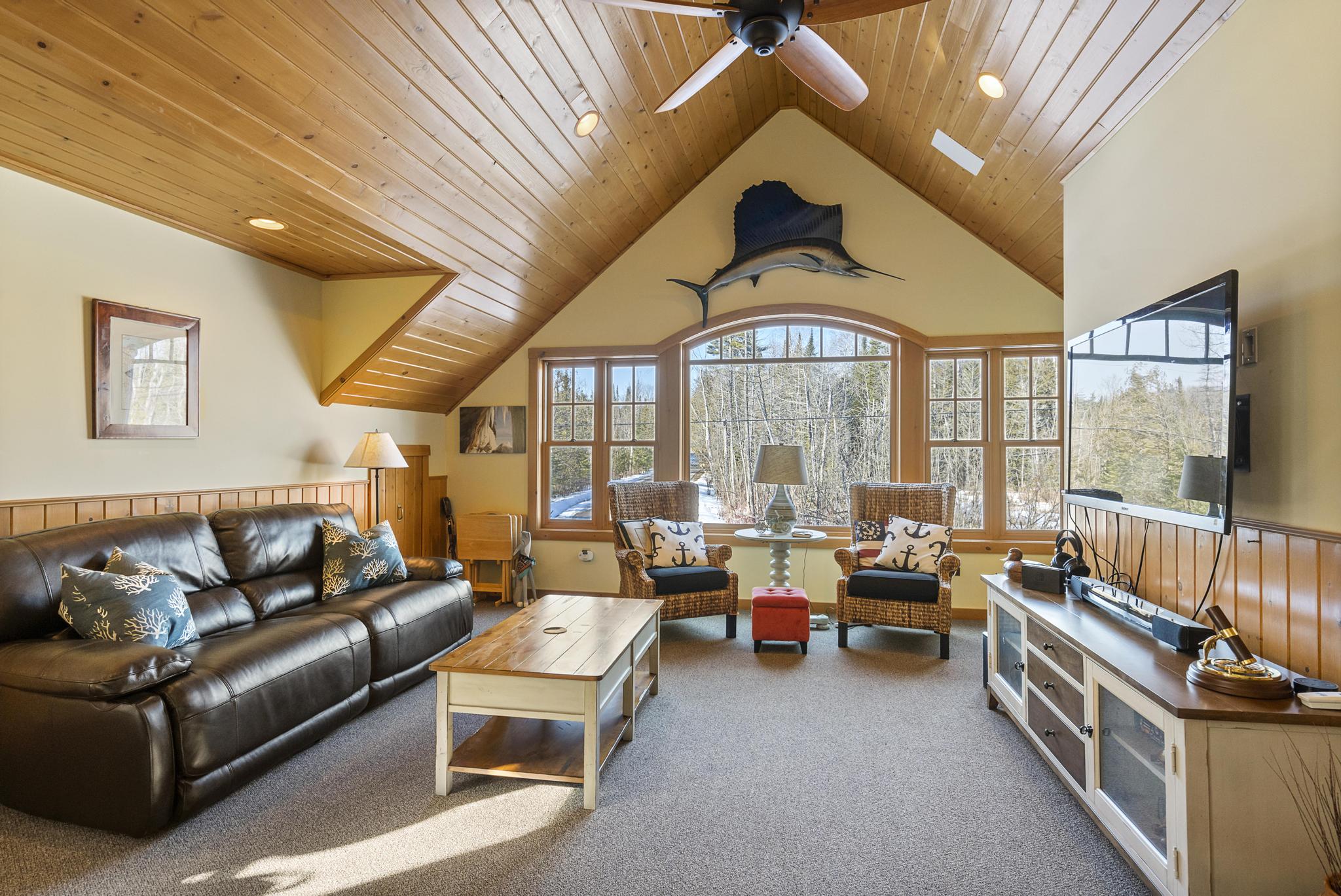 Upstairs are 4 more bedrooms and 2 full bathrooms. At the top of the stairs you will find two bedrooms with queen beds one with an en suite and the other with a full bathroom across; both of these bedrooms have balcony access overlooking the lake. Down the hall is another large living room area and a kitchenette. Two full bedrooms surround this living area- one bedroom with two twins and the other with 2 bunk beds and a queen pull out (sleeping 6 total). Across from these bedrooms is another full bathroom.